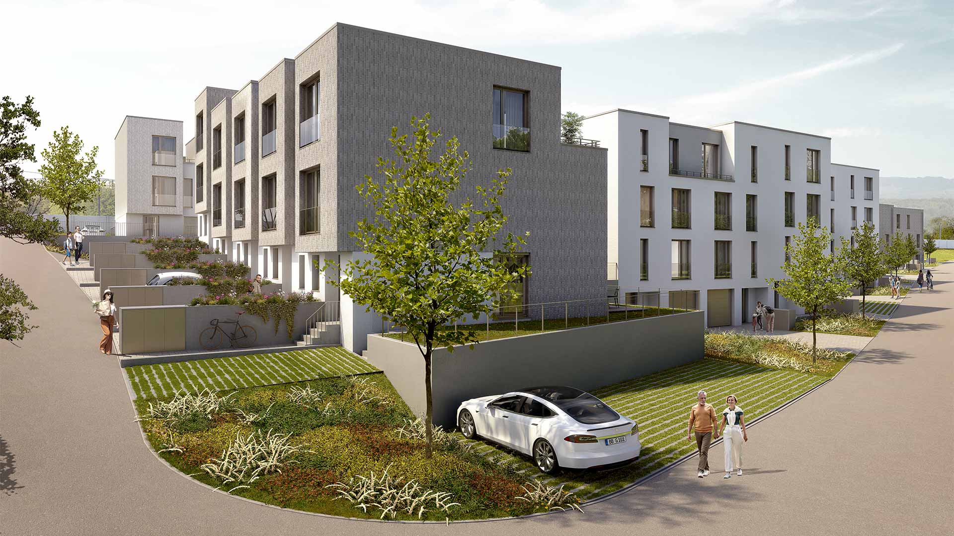 Alle Doppel- und Reihenhäuser verfügen über 2 Stellplätze (außen und/oder in der Garage/unter dem Carport) mit 230 V Steckdose in der Nähe des Stellplatzes.